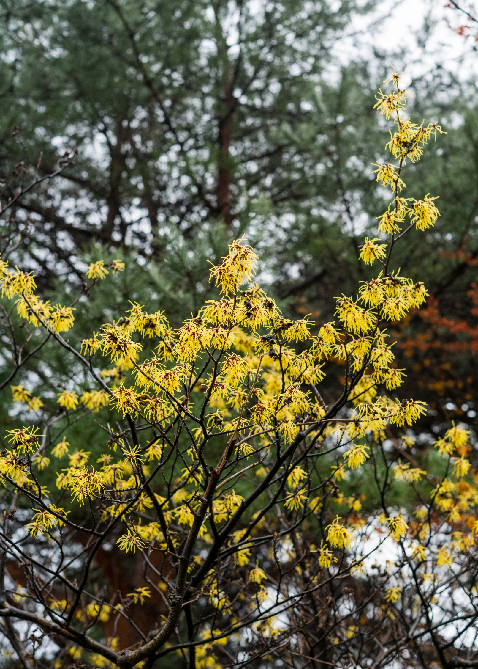 Witch Hazel’s late-fall blooms add a vibrant yellow pop to their muted winter backdrop and come equipped with a serious cold hardy tolerance. As their flowers bloom, you can find their fruit maturing simultaneously, which is where the plant’s name, Hamamelis (meaning “together with fruit”) originates. Once established, Witch Hazel holds its own, being cold hardy, drought tolerant, and quite pest resistant. They make reliable shrubs to track down underground water sources in the wild and are sometimes referred to as “water-witches” because of such.